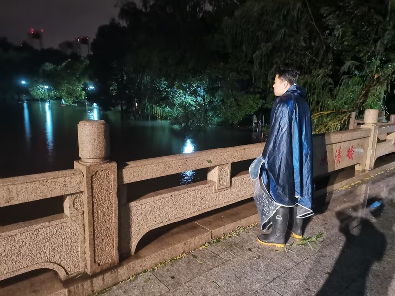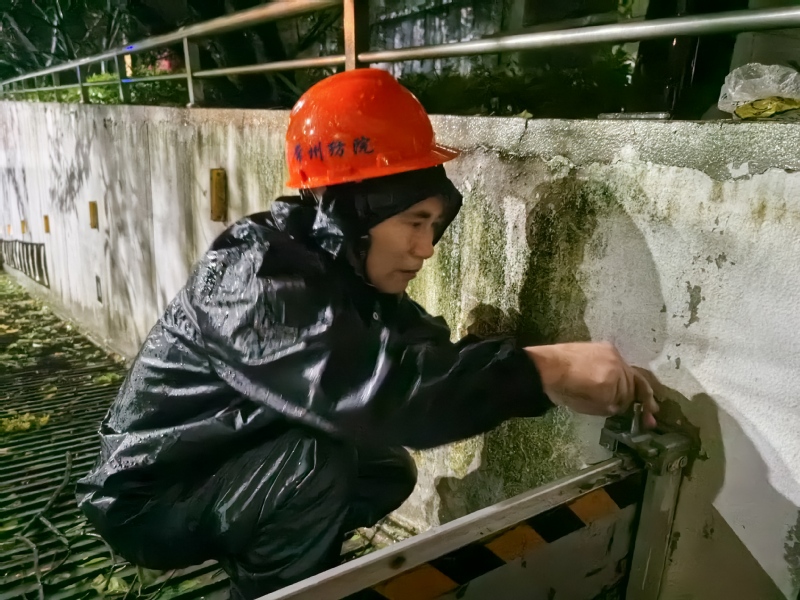 9月16日,台风肆虐,值守人员不惧风雨,奋勇前行,多次前往设备房、地库、河道等高风险区域进行巡查。发现有无法上锁的门窗,紧急使用绳索捆绑牢固,以免强对流造成撞击损毁;巡回排查重点区域,包括学生宿舍楼顶、配电房、河边、玻璃屋顶、石材外立面等,对发现的学生宿舍区渗水区域进行排查,及时疏通排水管道,保障排水通畅;检查河边警示标志、设置警戒线,要求学生远离高空玻璃、石材区域,减少安全隐患。各条线值班人员24小时坚守在抗击台风第一线。
