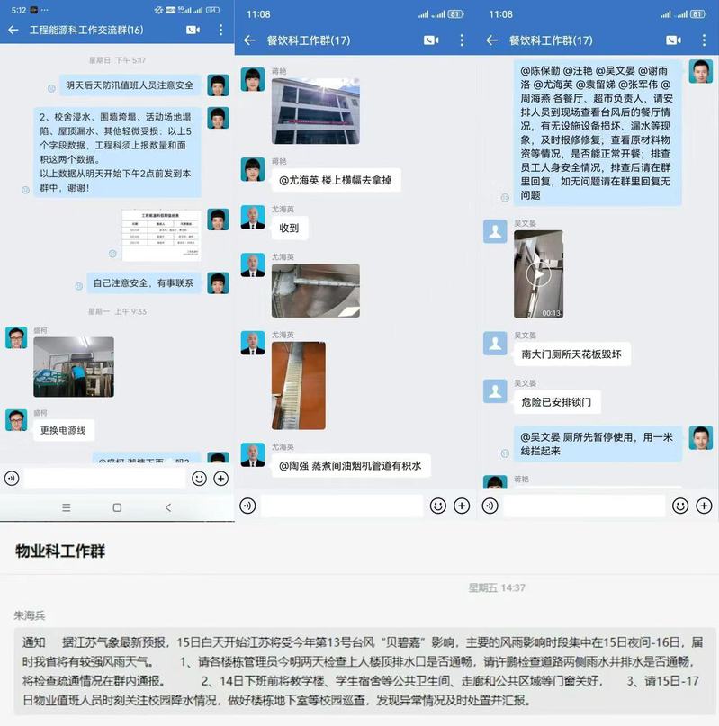 台风逼近之际,后勤保障部按学校党政要求积极部署,制订防汛应急预案,向全校各单位、教职工发布预警,强调关紧门窗,注意安全,全力以赴保障在校师生生命财产安全。校园范围内实施责任包干制,落实到人,对校园重点部位进行拉网式巡查,检查每栋楼屋顶,做好防雷测试,排查所有设备设施,在相关责任区域(高配房、1#楼、7#楼、8#楼)放置防汛材料,布置挡水板,检查地下室排水设备运转情况,安排抢险值班表。实施防台日报制及动态巡查制,充分利用新媒体平台、工作群等渠道,针对台风天气情况,校园建筑物、绿化等受损情况,河道水位变化情况,动态监控和报送,及时掌握台风进展情况。