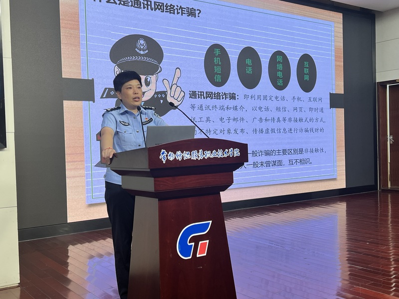邹幼红副所长从电信诈骗的概念、常见的电信诈骗类型、如何防范电信诈骗和保护好个人信息四个方面入手,结合近期高发的诈骗类型、手段及特点,以当下学生群体喜闻乐见的方式,用通俗易懂的语言向学生讲解了身边常见的诈骗陷阱,如刷单诈骗、游戏账号充值诈骗、裸聊敲诈、冒充熟人诈骗等在学生群体中易发的诈骗类型,并提出了有针对性的应对防范措施,提醒同学们日常生活中要提高警惕,提升自我安全防范意识,守护好自己的钱袋子。