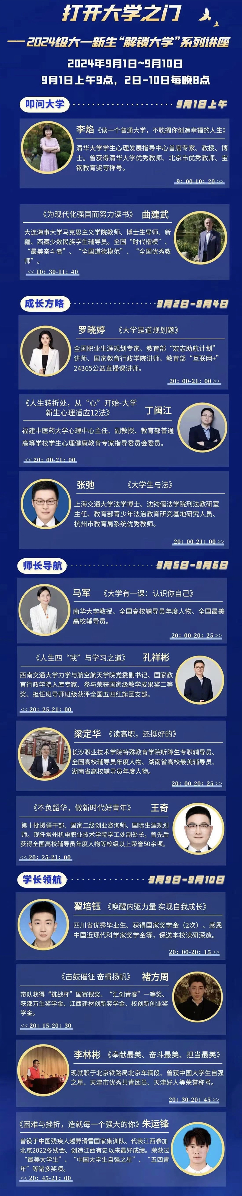 为支持新生成长,9月1日-9月10日学生处联合团委借助校外优质课程资源组织全体新生参加“打开大学之门‘解锁大学’系列讲座”,该系列讲座由大连海事大学曲建武教授领衔,分为叩问大学、成长方略、师长导航、学长领航四个单元,来自全国的专家学者、最美辅导员、辅导员年度人物、大学生年度人物与新生探讨大学生活“奋斗的目的”“学业、职业和人生规划”“转折时期的心理调适”“大学生与法”“大学的时间管理”等,全面探讨大学生活的方方面面,帮助新生们提前做好思想与学业的准备,开启全新的大学篇章。