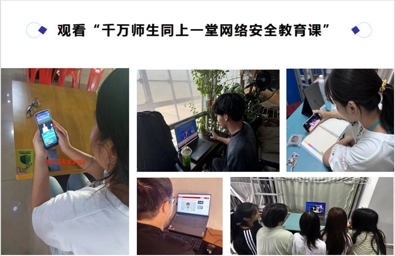 9 月9日至22日,党委宣传部、学生处、二级学院组织全体新生观看“千万师生同上一堂网络安全教育课”,广泛动员全体新生参加教育部“守护青春 网络有你”全国大学生网络安全知识答题活动,网课由国家反诈中心民警林德海警官、北京理工大学网络空间安全学院特别副研究员曾亮老师、天津理工大学马克思主义学院团总支书记、天津青年五四奖章获得者万柯彤老师从防范电信诈骗、个人信息保护、规范网络行为等方面讲授网络安全教育公开课。普及防范网络诈骗、安全使用网络等知识。同学们表示“信息化时代,增强防骗意识、树立正确的消费观、健康积极使用网络,共同维护良好网络环境,是每个大学生的职责。”