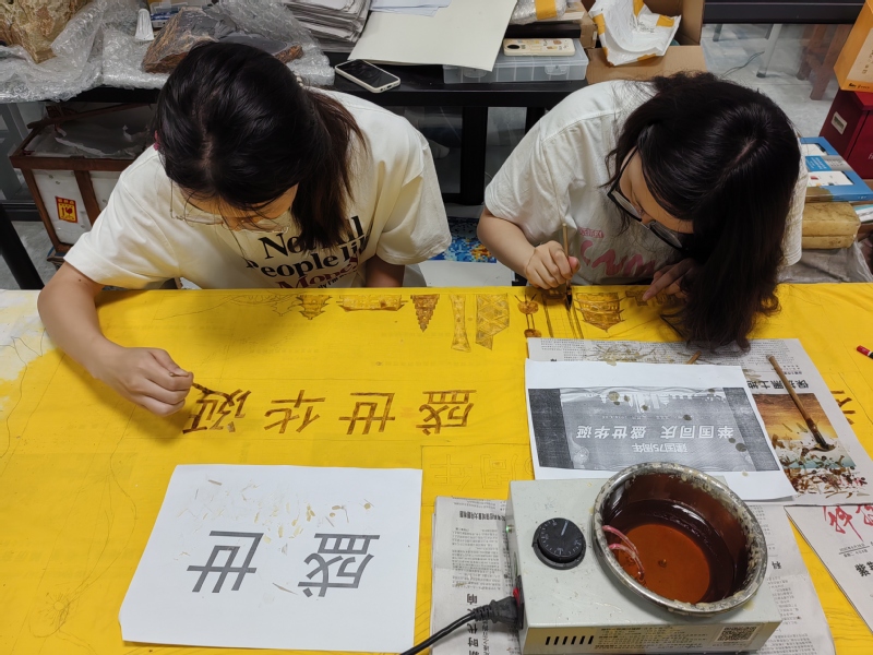 “这副作品,我们从6月份开始策划实施,从选择哪些场景展现新中国成立以来取得的成就,到如何呈现这些成就,学校和服装学院的相关领导、老师给了我们很多指导和建议。”服装与时尚设计学院设计2332班刘鑫洋、崔倩倩等同学参与了作品的大部分创作,为了效果能够尽善尽美,她们和10余名同学利用课余时间在张际仲老师的指导下从早到晚连续制作了一个月。“作品上的每一滴蜡,每一道工序,都饱含了我们对祖国的爱。”刘鑫洋说。