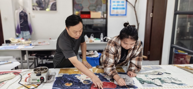 蜡染是我国民间传统纺织印染手工艺,制作过程以蜡刀蘸取熔化的蜜蜡,在底布上绘制图案,再通过染料浸染上色,有蜡附着的部分不被浸染从而保留原来的颜色。“我们引导学生以“蜡”为墨,将非遗技艺与时代精神有机融合,用工匠之心传承技艺,不断培育民族认同感,树立文化自信。”扎染工作室负责人、作品指导老师张际仲说,“立足专业价值塑造精神富矿,以项目为抓手,不仅让学生充分感受到蜡染绘画的魅力,也为学生重温历史、传承红色精神、时代精神搭建了平台。”