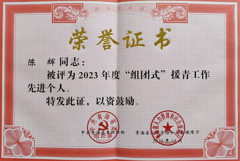2023年12月,陈辉同志被中共青海省委组织部授予“‘组团式’援青工作先进个人”称号。