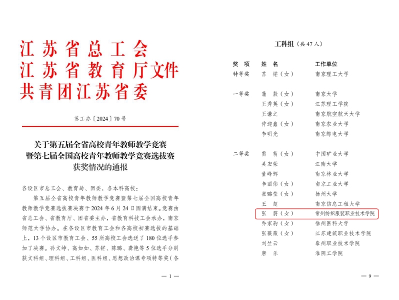2024年6月21至24日,第五届江苏省高校青年教师教学竞赛暨第七届全国高校青年教师教学竞赛选拔赛在南京师范大学仙林校区举行,永利官网智能制造学院张蔚老师荣获工科组二等奖。