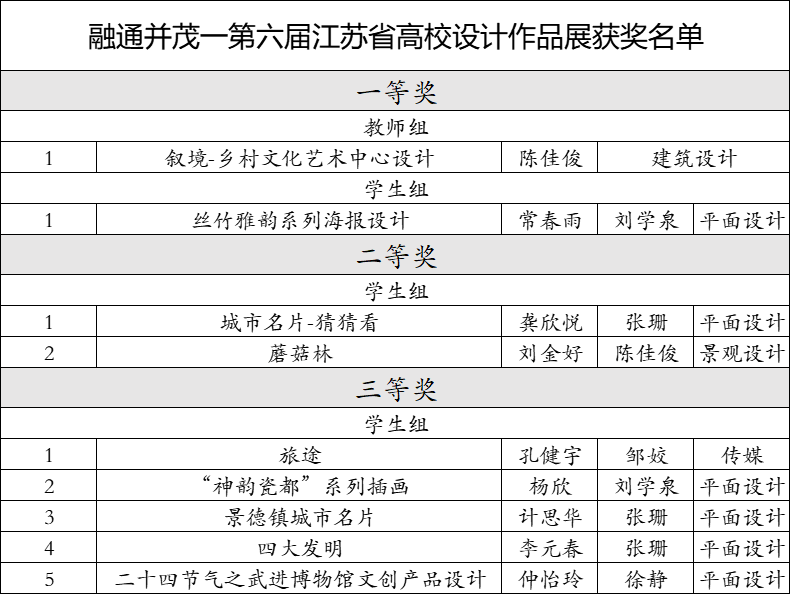 近日,江苏省教育厅主办的“融通并茂——第六届江苏省高校设计作品展”获奖名单揭晓。创意设计学院师生参赛作品得到评委高度肯定,荣获教师组一等奖1项,学生组一等奖1项、二等奖2项、三等奖5项。