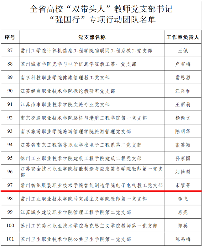 高校“双带头人”教师党支部书记“强国行”专项行动是教育部为创新落实立德树人根本任务,深入贯彻落实教育部党组关于高校“双带头人”教师党支部书记培育工作的重要举措。电子电气教工党支部是首批江苏省党建工作样板支部培育创建单位,支部不断创新发展理念,肩负起为党育人、为国育才的重大使命,对接纺机制造和智能制造高端产业,致力于培养大国工匠、能工巧匠,服务中国式现代化建设,建有省碳纤维先进材料智能制造工程研究开发中心、三菱智能制造产业学院和杰克服装智能制造产业学院。党支部在人才培养、应用研究、技术开发和科研成果转化等方面服务地方经济社会发展,解决纺织机械行业“卡脖子”问题,为企业创造经济效益。依托产业链党建,组建科技创新服务团,承担了省级课题5项,市厅级课题6项,企业横向课题15项(到账资金200余万元),授权发明专利8项,实用新型专利20余项。支部书记宋黎菁获常州市师德模范、五一劳动奖章、岗位学雷锋标兵等荣誉;党员教师获省五一创新能手1人次、省技术能手3人次、省巾帼建功标兵1人次,校优秀党务工作者5人次、优秀党员5人次。