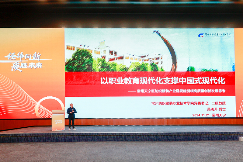 吴访升以“以职业教育现代化支撑中国式现代化——常州天宁区纺织服装产业链党建引领高质量创新发展思考”为主题开展专题报告。 他围绕中国式现代化的理解、职业教育现代化的思考、常纺改革创新实践探索三个方面深入浅出地进行了详细阐述,为常州天宁区纺织服装产业链的发展提供了新的思路和方向,更为职业教育现代化支撑中国式现代化的实践探索提供了有益的借鉴和参考。