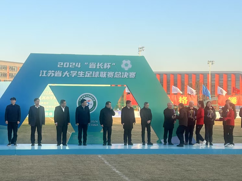 12月8日,2024“省长杯”江苏省大学生足球联赛总决赛暨闭幕式在南京农业大学滨江校区举行,省教育厅、省体育局为高职高专组冠亚季军代表队颁发奖杯,党委书记吴访升带队参加颁奖仪式,体育部部长孙开宏和足球队教练陆爽老师参加颁奖。