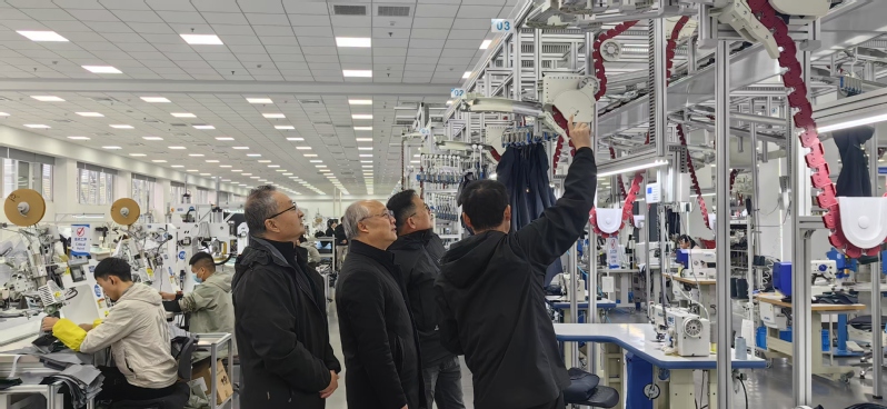 永利官网调研组先参观了波司登国家级智能制造示范工厂。波司登智能制造示范工厂行政部负责人沈国华、永利官网2006级校友服装IE部负责人徐经纬详细介绍了波司登智能工厂建设运行情况。公司以“智改数转网联”为抓手,创新“制造+数字+服务”模式,加快推动传统服装产业创新“蝶变”,自动充绒、自动包装、自动模板等关键生产环节自动化水平已经超过90%。此外,该企业将大数据技术应用于设计研发、采购制造、仓储物流等多个环节,实现以消费者为中心的数字化“研产供销服”全链路协同,显著提升了运营效率和决策的准确度。