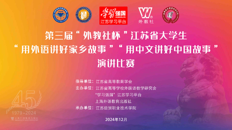 近日,由江苏省高等教育学会指导、江苏省高等学校外国语教学研究会、“学习强国”江苏学习平台、上海外语教育出版社主办,江苏经贸职业技术学院承办的第三届“外教社杯”江苏省大学生“用外语讲好家乡故事”“用中文讲好中国故事”演讲比赛决赛顺利举行。