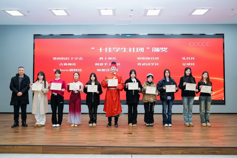 会上,学生社团建设管理评议委员会单位领导分别为2023-2024学年“学生社团活动积极分子”“优秀学生社团干部”“优秀学生社团指导老师”“优秀学生社团”“十佳学生社团”等先进集体和个人颁奖。“十佳学生社团”代表,X-show模特社社长张金芮上台发言。