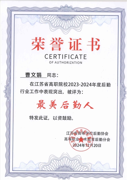12月25日,高等职业技术教育后勤分会第二届第三次会员大会暨后勤论坛在扬州成功举办,永利官网被评为“2023-2024年度江苏省高职院校后勤行业先进单位”,曹文娟被评为“2023-2024年度最美后勤人”。