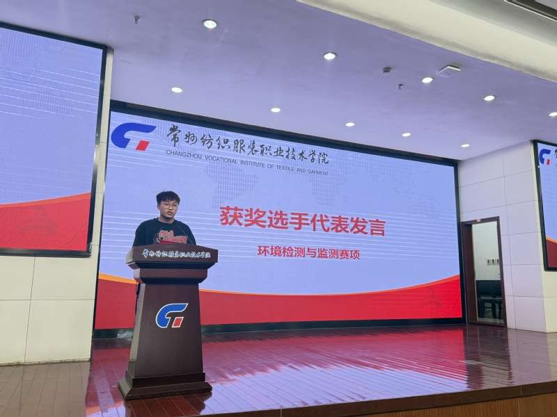 在经验分享环节,省技能大赛获奖选手代表依次登台发言。纺织品检验与贸易赛项获奖选手施睿明同学表示,备赛过程不仅强化了专业技能,更锤炼了团队协作与抗压能力;化学实验技术赛项获奖选手孙德政同学则从细节出发,分享了实验设计与操作规范的重要性;环境检测与监测赛项获奖选手陆寒松同学则从“实战应变”角度出发,剖析了现场突发问题处理的策略。指导教师代表周子涵博士,提出“以赛为镜、以技为媒”的教学理念,强调竞赛对教学反馈的积极作用,并呼吁更多教师参与指导,助力学生突破自我。