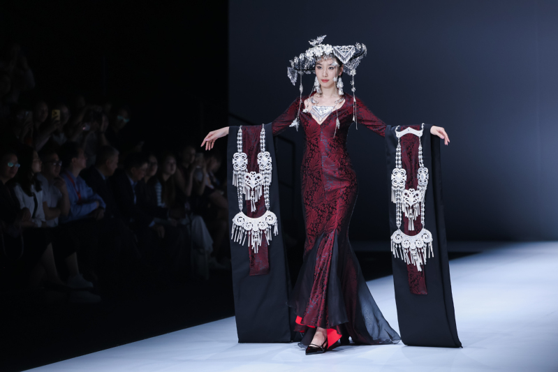 篇章二“华彩”展现中华优秀民族服饰文化的绚烂多彩,运用苗绣、藏纹等民族元素,融入现代设计理念,打造出兼具民族特色与当代审美的服装作品,展现民族文化的独特韵味与生命力,表达当代青年对民族文化的传承与创新。