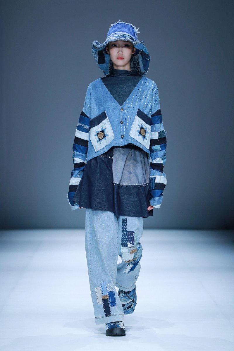 作品采用“织界”“华彩”“焕承”三个篇章呈现。篇章一“织界”以“织”呼应纺织工艺,以“界”暗喻不同布料的跨界融合,并运用多种牛仔面料进行创新拼接与剪裁,在保留牛仔个性的同时赋予服装全新质感,演绎出别样质感与风貌,彰显学子对服装材质与工艺的深入探索。