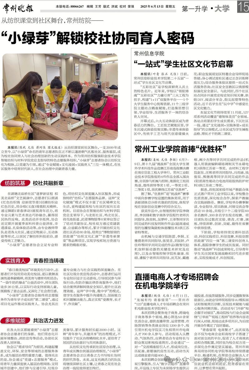 从纺织文化传承到社区综合治理,从青年成长舞台到基层治理枢纽,小绿芽志愿者协会正以青春之力书写校社协同的时代答卷。未来,这支充满活力的队伍将继续深耕社区土壤,让青春之花在社会治理一线绽放得更加绚烂。