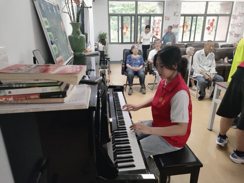 实践团成员携缤纷物料为公寓注入青春动能。在手工疗愈环节,青年学子化身“创意引路人”,通过“三步教学法”引导老人将扭扭棒化作春日繁花。82岁的王奶奶布满皱纹的手指在粉色材料间灵巧翻飞,当第一朵“重生之花”绽放掌心时,银青两代人的创作热情在指尖流转。活动特设“乐龄时光机”环节,团队成员吕欣芮以钢琴独奏《我的祖国》引发全场共鸣,老人们自发合唱《社会主义好》,嘹亮歌声在活动室内久久回荡。