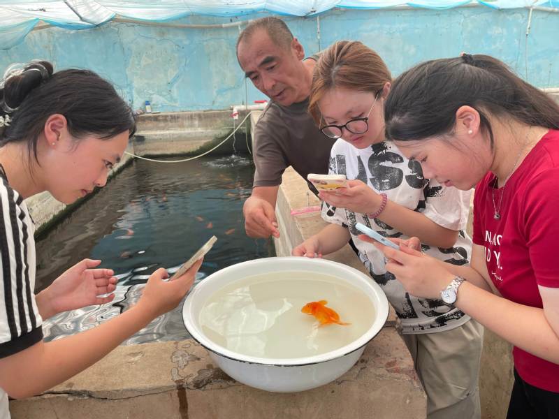 在养殖基地,队员们受到了基地负责人田大海的热情接待。田大海向师生们详细讲解了四腮泡金鱼的生长特性:从鱼苗孵化时对水质、水温的严苛要求,到幼鱼培育期需防范的疾病风险,每一个环节都凝聚着养殖户的心血。“这种金鱼的腮泡极易破损,稍有不慎就会前功尽弃,需要24小时不间断观察照料。”田大海的讲述让同学们深刻体会到特种金鱼养殖的艰辛。