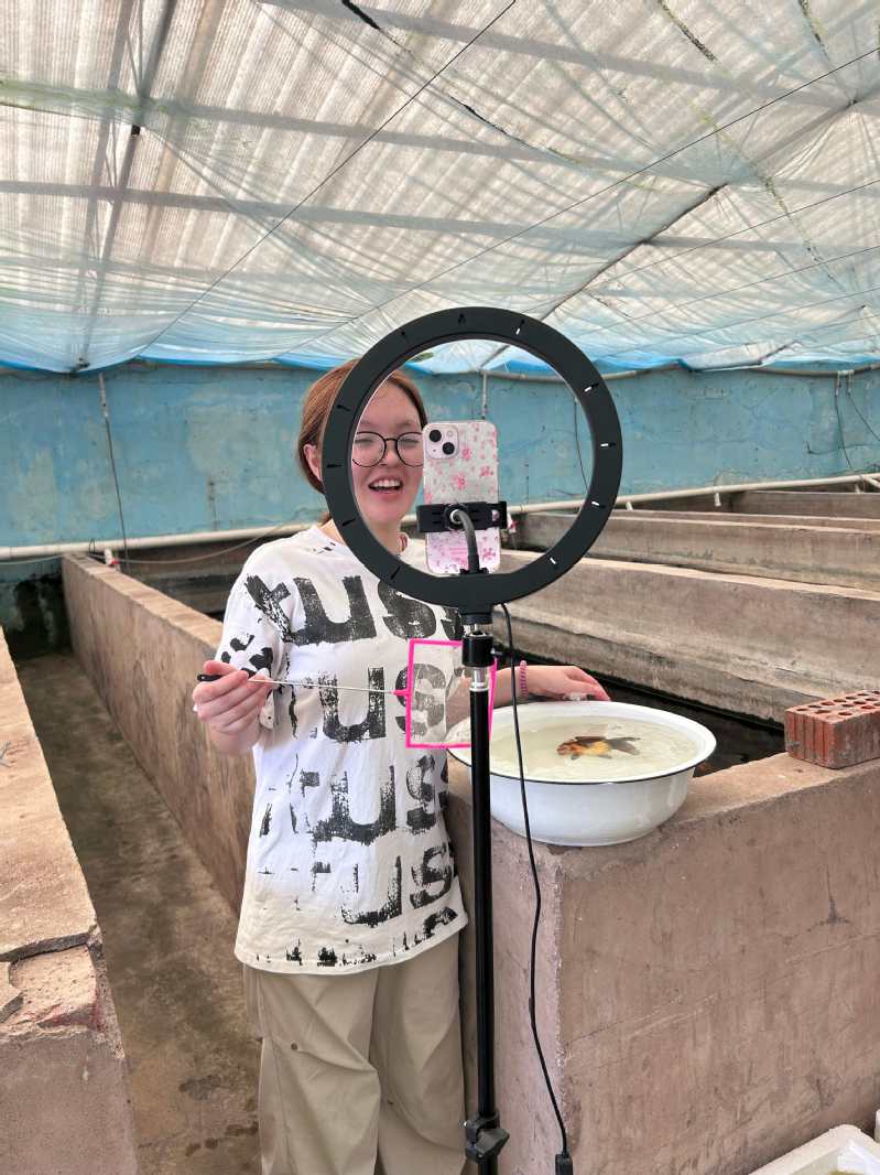 田大海表示今年四腮泡金鱼将推广上市,实践队队员充分发挥专业优势在养殖基地为企业进行直播带货及自媒体视频拍摄剪辑。数字商贸学院经贸教研室与企业积极对接,就自媒体营销方案与其达成初步合作意向。未来,数字商贸学院将进一步深化与洑家村四腮泡金鱼的合作,通过产学研结合助力特色产业发展,为乡村振兴与文化繁荣贡献高校力量。