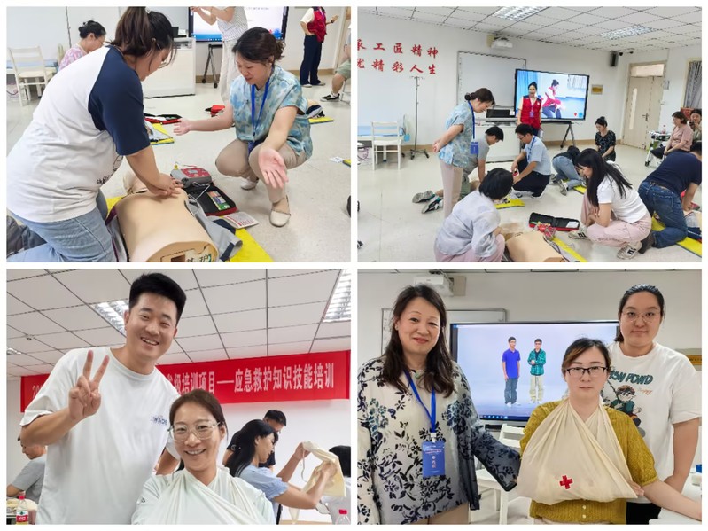 本次培训采用“理论筑基+实战砺能”的双轨模式,汇聚了省内急救领域顶尖专家资源。鼓楼医院吴建中教授解析的《常见急症与意外伤害的处理》、南京市急救中心吴俊贤主任医师主讲的《防灾避险与突发公共卫生事件应对》等课程,为参训教师构建起系统完整的急救知识体系。在江苏省红十字会专家指导下,参训教师重点攻克心肺复苏、AED 操作、创伤救护等核心技能,通过“示范-模拟-考核”闭环训练,有效促进了参训教师将理论知识深度转化为实践技能。