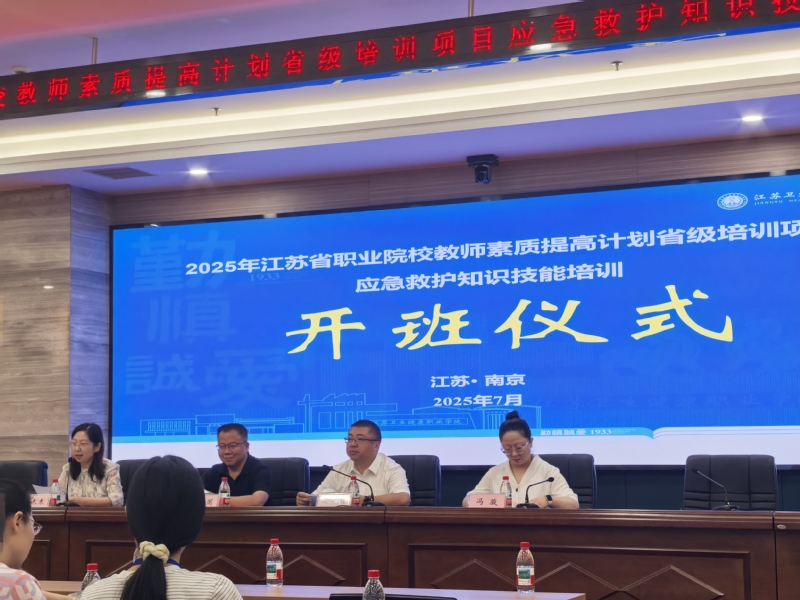 为深入贯彻落实《“健康中国2030”规划纲要》及职业教育高质量发展要求,进一步推进学校健康教育工作,推动学校全国急救教育试点学校建设,强化学校“生命至上”的健康教育理念。7月,后勤保障部、人事处、体育部协同组织的教师团队赴江苏卫生健康职业学院,圆满完成了 2025 年江苏省职业院校应急救护知识技能省级培训工作,为推进学校急救教育高质量发展奠定了坚实基础。省教育厅体卫艺处副处长常治国,江苏卫生健康职业学院党委委员、副院长方明明等领导出席了开班仪式。