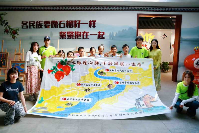 团队在同心绘美中铸牢“各民族像石榴籽一样紧紧抱在一起”的深厚情谊。大运河不仅是流动的水脉,也孕育了灿烂的文化,见证了红色精神、民族团结和共同富裕的光辉历程。团队成员绘制了一幅以“运河水脉连心脉,千籽同根一家亲”为主题的画卷。画卷上,运河水脉如同一根丝带,将四地连接在一起,描绘了大运河沿线各民族团结一心、携手共进的现实图景。
