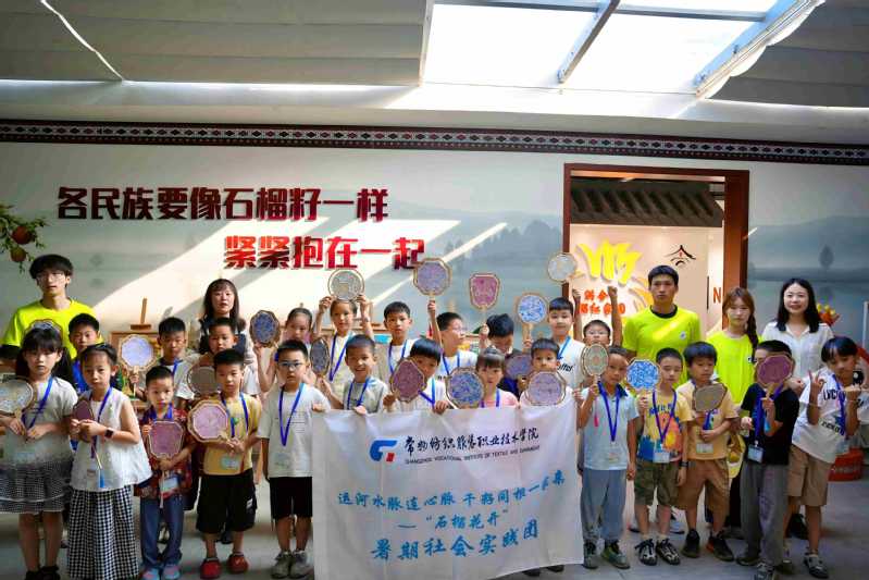 在方里村,团队通过手绘木制特色服饰挂件,在动手实践中感受中华文化的多样性与包容性。在洪合镇,与小朋友们共绘长达五米的“铸牢中华民族共同体意识”主题画卷——“红船”象征初心使命、“石榴”寓意民族团结、“粽子”承载地域文化、“恐龙”启迪探索精神、手牵手的民族人物形象,更传递了“中华民族一家亲”的情感纽带。团队成员还带领小朋友们走进非遗文化的世界,亲手制作非遗宋锦珍珠团扇。