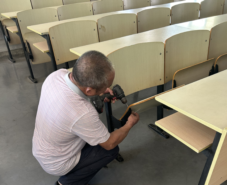 教辅改善,夯实教学保障基础。学校党政高度重视教辅环境提升,利用暑期组织开展了5号楼、9号楼公共教室课桌椅隐患排查与维修工作。工作人员对两栋楼公共教室课桌椅逐间逐套排查,重点检查稳固性、部件松动及破损情况,详细记录问题,分析情况,实施分类施修,对松动部件紧固、轻微破损处修补、严重损坏件更换。暑期排查课桌椅3060套,发现问题设施60多套,维修完成率100%,有效消除安全隐患。