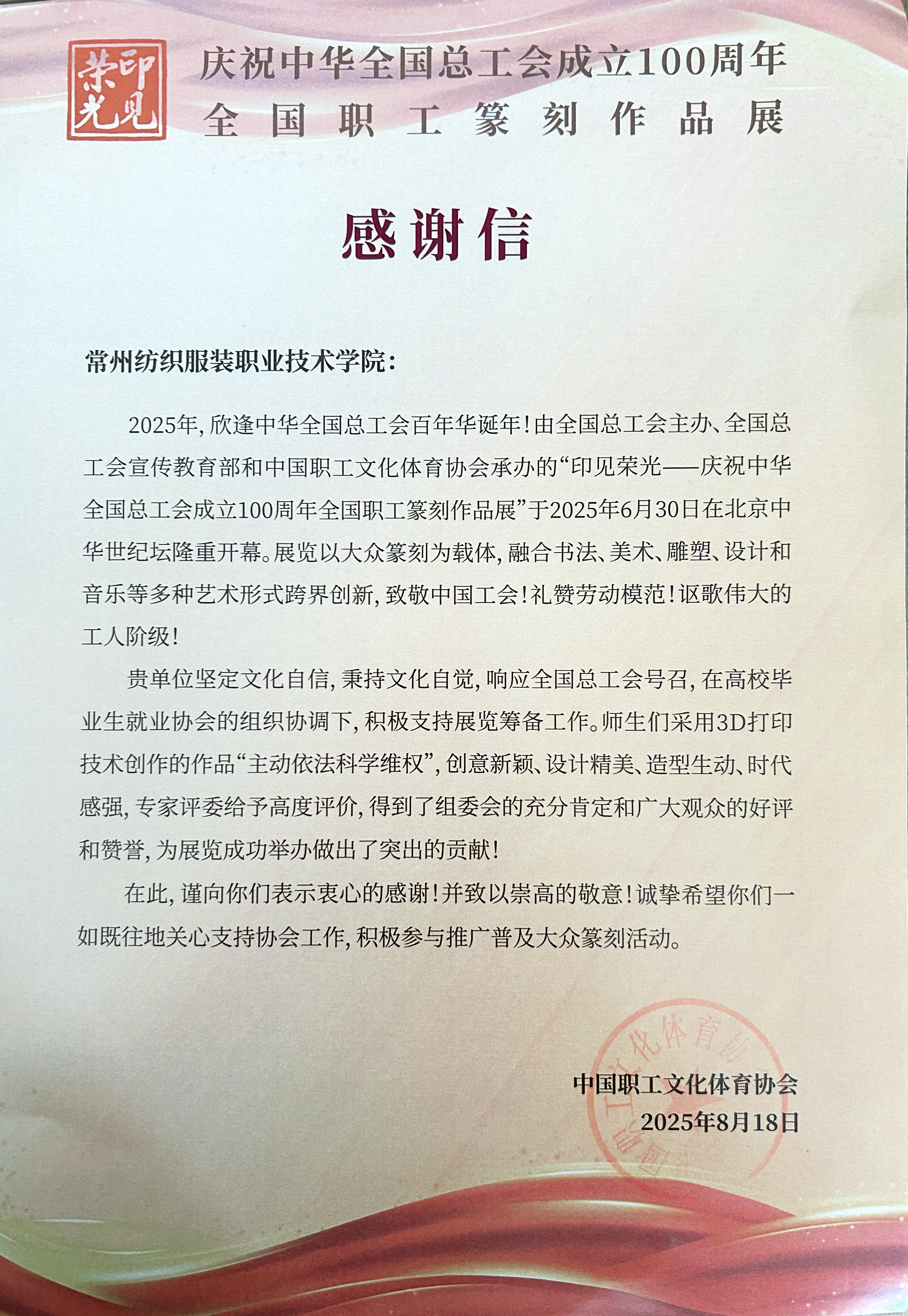本次展览以中国印与篆刻艺术为媒介,汇聚了来自全国各地、各行业职工的500余件作品,全景展现了我国工人运动的光辉历程。永利官网教师团队的作品印面为“主动依法科学维权”,边款记述了2006年12月全国总工会十四届十一次主席团(扩大)会议提出的“牢固树立中国特色社会主义工会维权观”,其核心内容为“以职工为本,主动依法科学维权”。该作品将传统金石艺术的独特魅力与现代3D打印等技术相融合,创作出既富有艺术性又具普及性的新型印章作品,不仅彰显了篆刻艺术的传统韵味,也深刻阐释了工会维权理念的时代内涵,实现了工会历史与艺术创新的有机统一,最终从众多参展作品中脱颖而出。