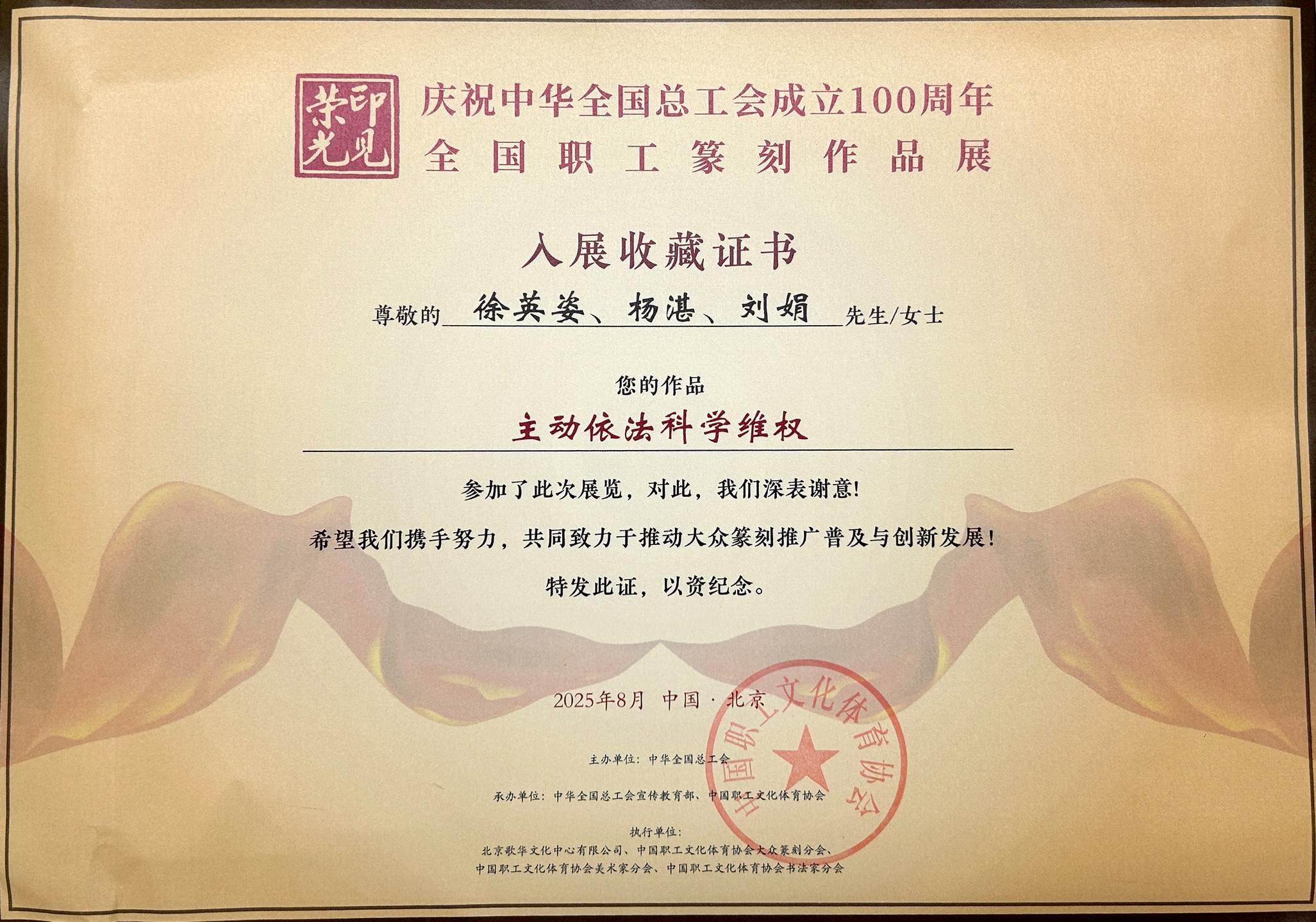 由永利官网工会组织推荐,创意设计学院徐英姿、杨湛、刘娟三位教师组成的创作团队紧扣主题精心创作的篆刻作品,经严格评审,成功入选本次展览,并被授予“入展收藏证书”。